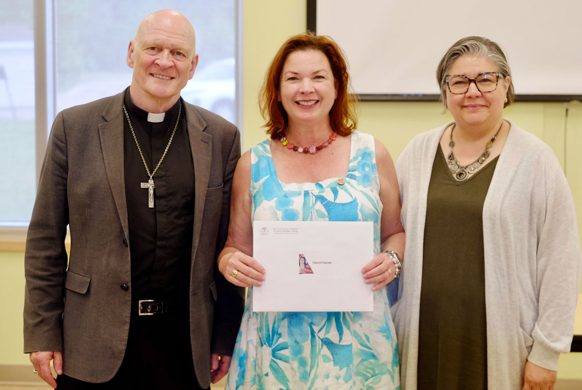 Participant Cheryl Unruh (centre) received her IPL diploma from Bishop Mark Hagemoen and IPL facilitator Cristin Dorgan Lee. (Photo by Kiply Lukan Yaworski, Catholic Saskatoon News)
