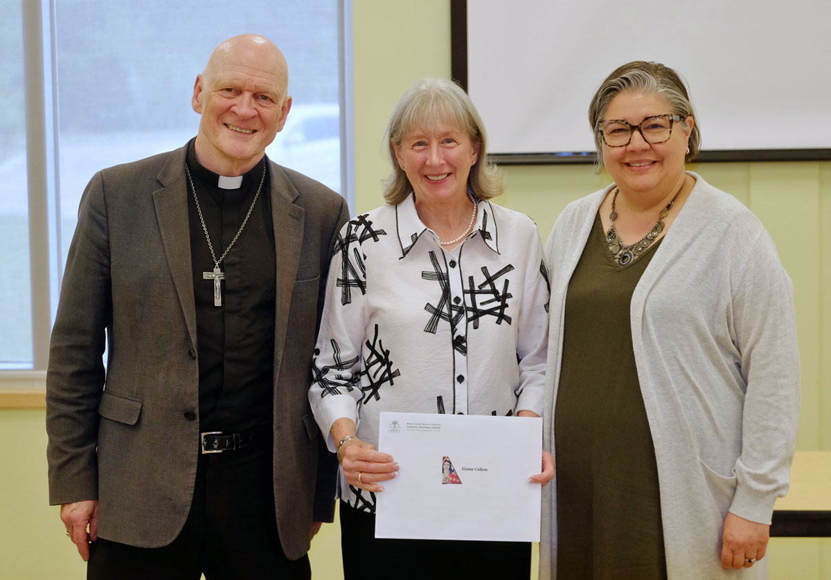 Participant Elaine Callow (centre) received her IPL diploma from Bishop Mark Hagemoen and IPL facilitator Cristin Dorgan Lee. (Photo by Kiply Lukan Yaworski, Catholic Saskatoon News)