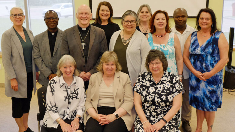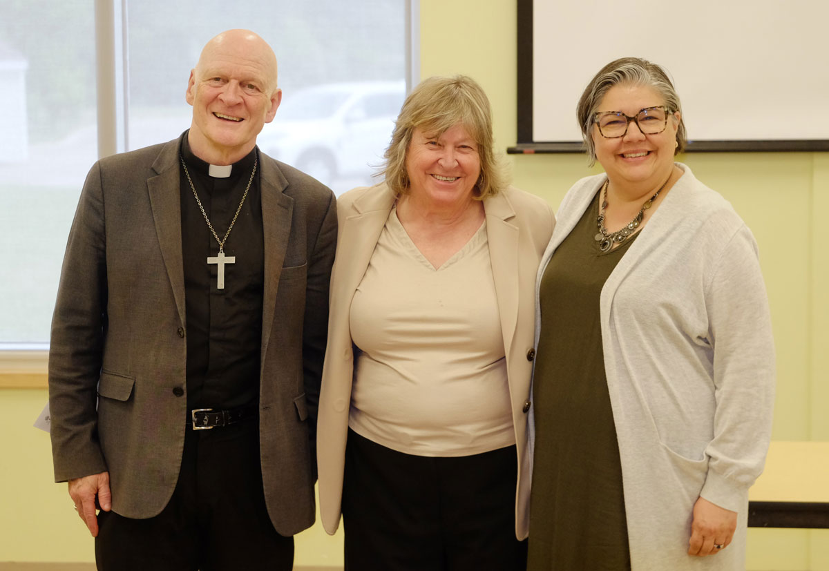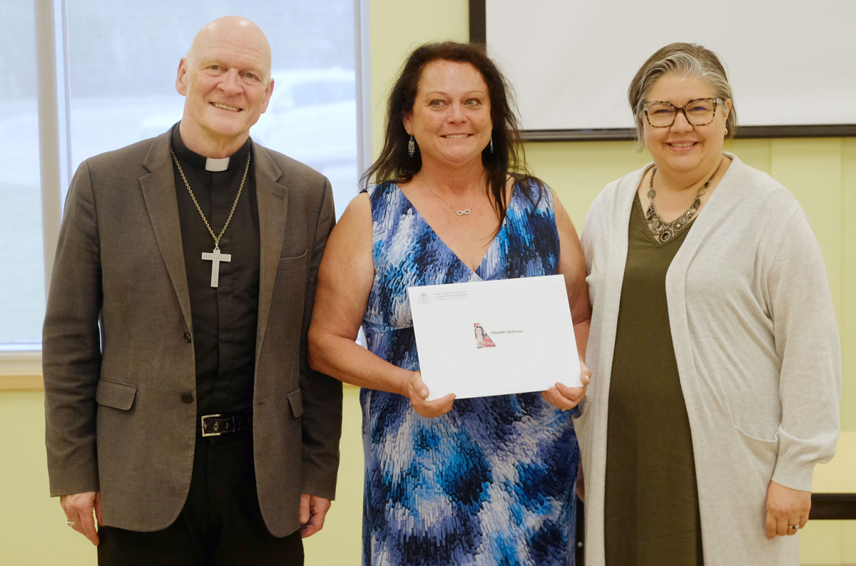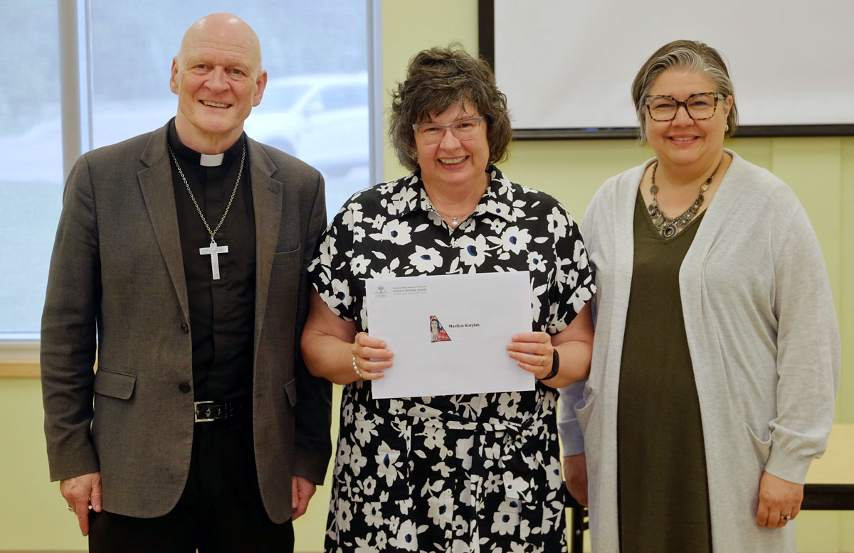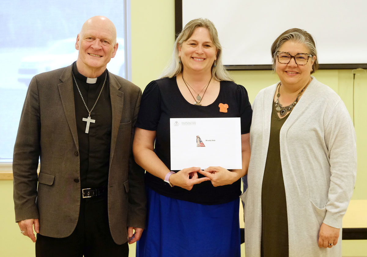 Participant Wendy Dale (centre) received her IPL diploma from Bishop Mark Hagemoen and IPL facilitator Cristin Dorgan Lee. (Photo by Kiply Lukan Yaworski, Catholic Saskatoon News)