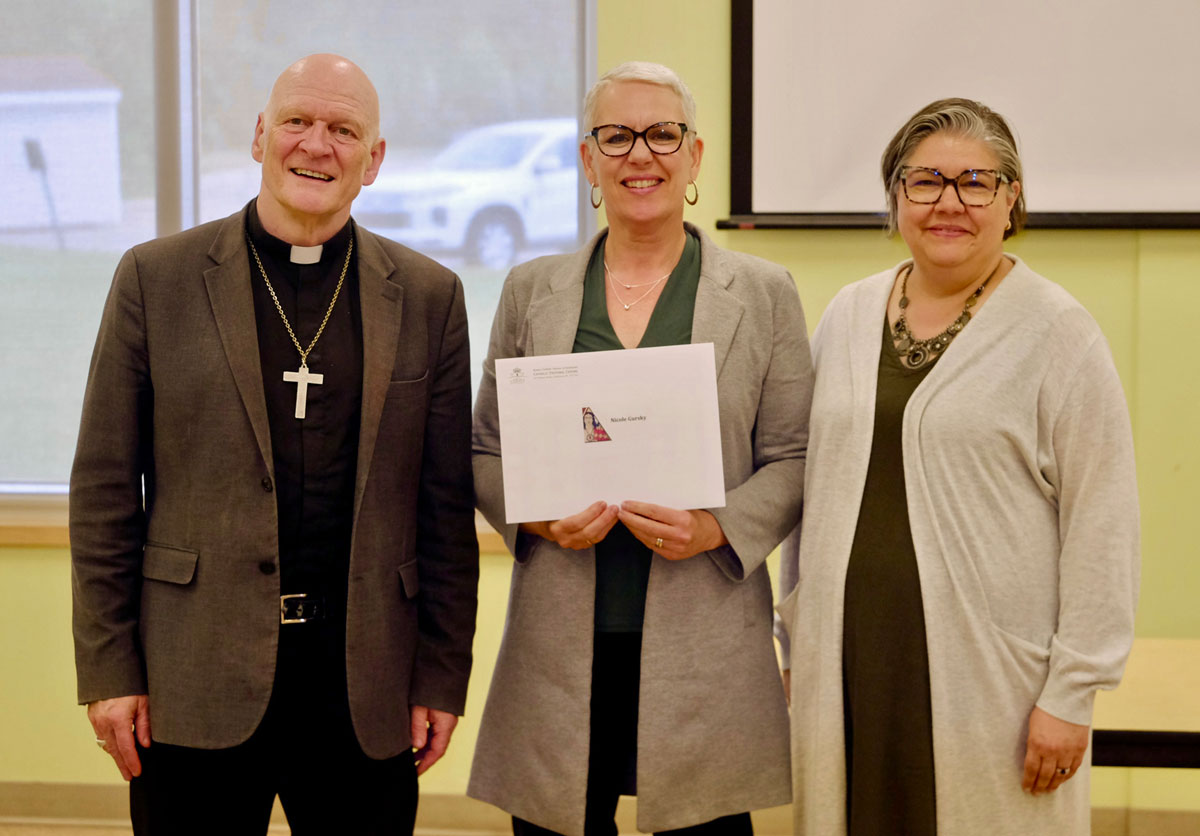 Participant Nicole Gursky (centre) received her IPL diploma from Bishop Mark Hagemoen and IPL facilitator Cristin Dorgan Lee. (Photo by Kiply Lukan Yaworski, Catholic Saskatoon News)