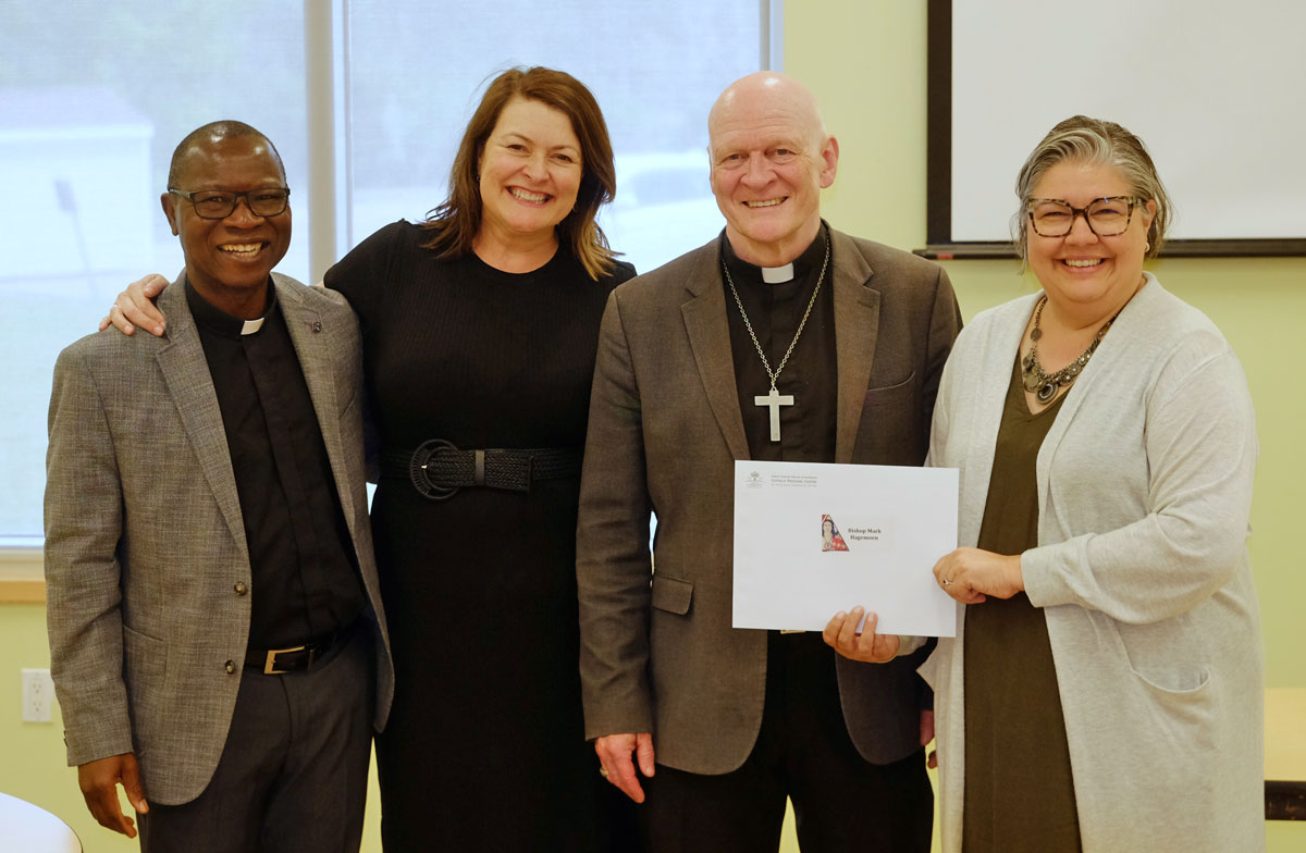 IPL leaders (l-r) Fr. Joseph Salihu, Adrienne Castellon, Bishop Mark Hagemoen, and Cristin Dorgan Lee. (Photo by Kiply Lukan Yaworski, Catholic Saskatoon News)