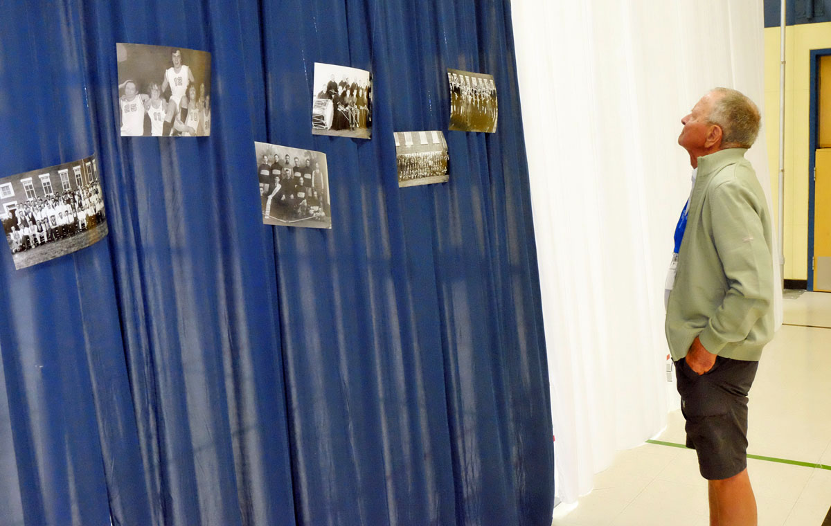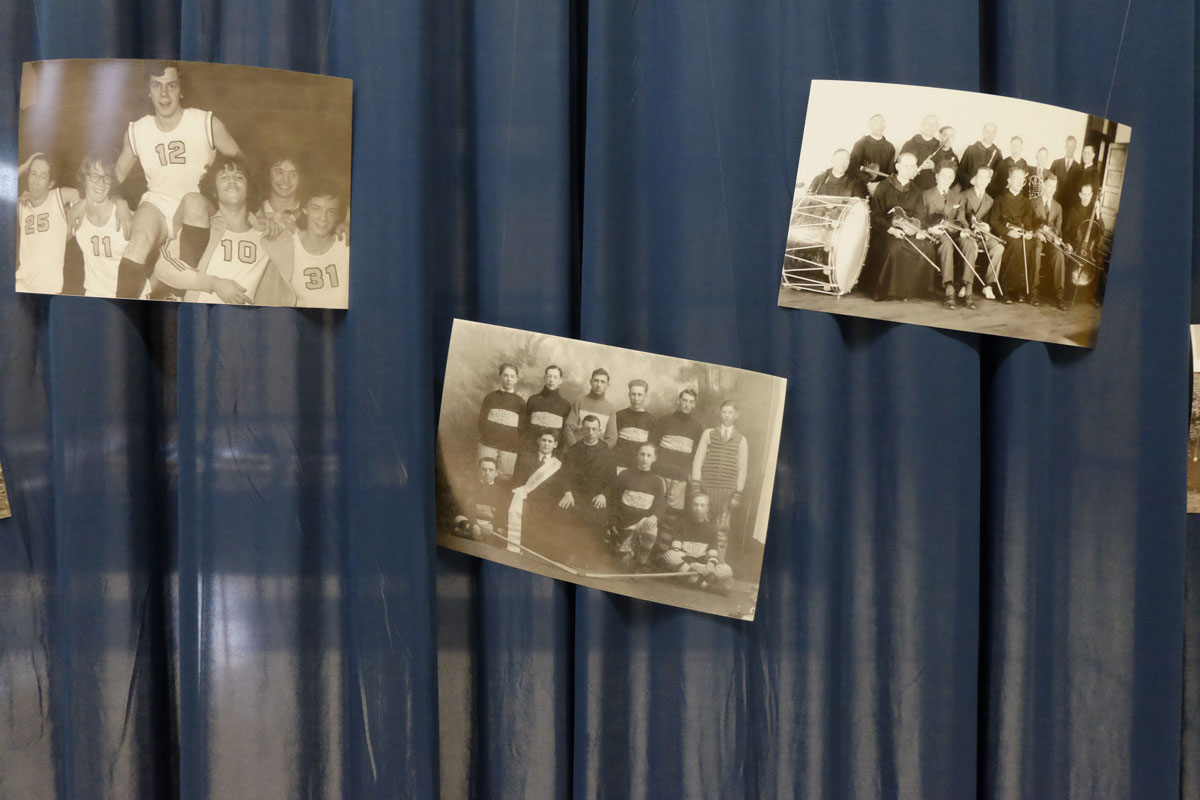 Photos from through the years were on display in the St. Peter’s College gymnasium, which was transformed into a banquet hall for the alumni reunion. (Photo by Kiply Lukan Yaworski, Catholic Saskatoon News)