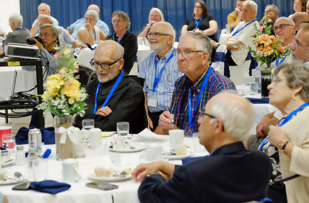 During the banquet program July 26 in the St. Peter’s College gymnasium, MC John Kreiser welcomed alumni and special guests and introduced the monks of St. Peter’s Abbey in attendance: Brother Basil Schaan, OSB, administrator of the Abbey; Brother Kurt Van Kuren, OSB; Brother Benedict Van Ginkel, OSB; Fr. Cosmas Epifano, OSB; Fr. Richard Meidl, OSB: and Fr. Lawrence DeMong, OSB.