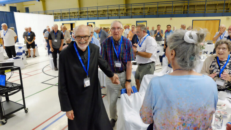 Brother Basil Schaan, OSB, of St. Peter’s Abbey led grace for the reunion banquet July 26, held in the SPC gymnasium. (Photo by Kiply Lukan Yaworski, Catholic Saskatoon News)