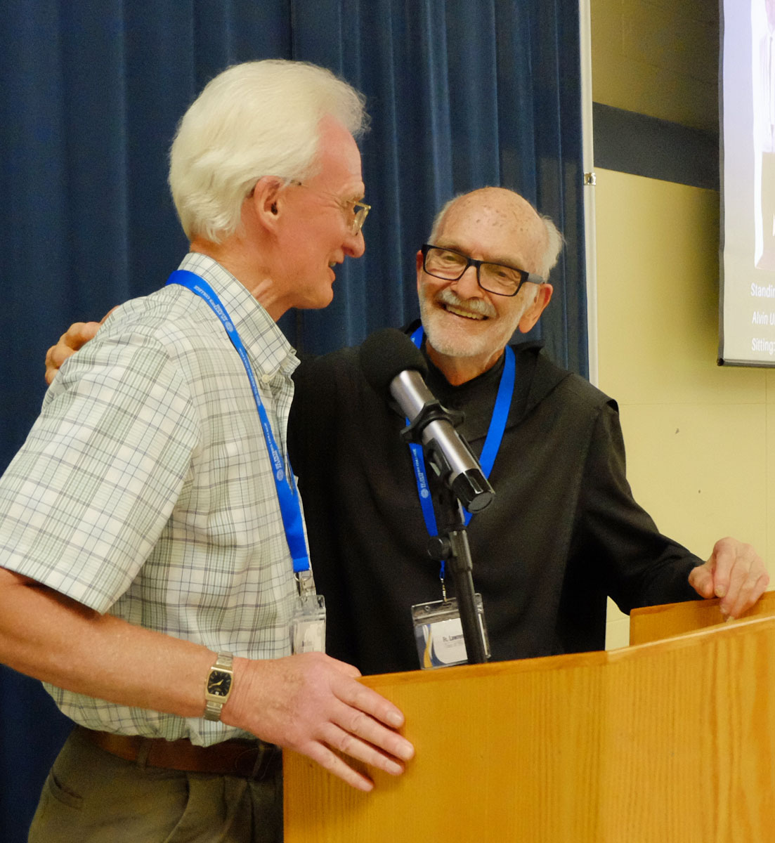 Don Ross (left) led a number of toasts, including one for fellow-alumnus Fr. Lawrence DeMong, OSB, (right) who taught high school and university courses at St .Peter’s College, and has served as a chaplain to students as well. (Photo by Kiply Lukan Yaworski, Catholic Saskatoon News)