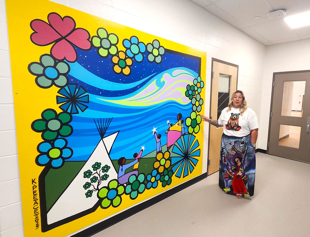 Greater Saskatoon Catholic Schools Community and Resource Development’s Ashley Petite points to a painting created by Indigenous artist Kevin Peace during a recent media tour of the new facility. (Photo by Jon Perez, Catholic Saskatoon News)