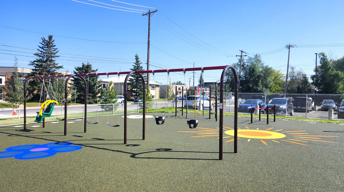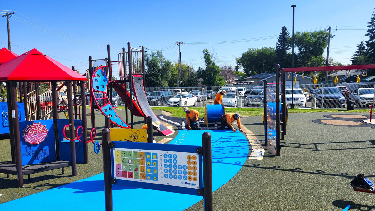 Putting the finishing touches on the school playground. (Photo by Jon Perez, Catholic Saskatoon News)