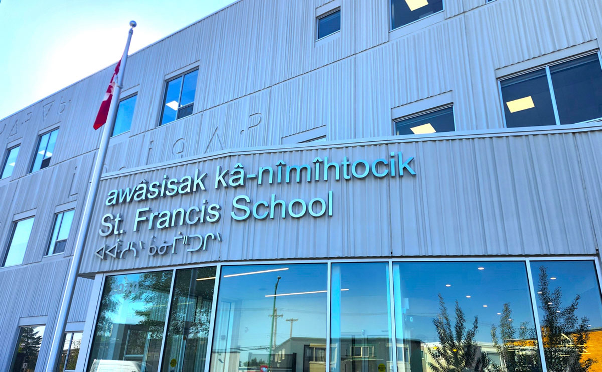 The Cree bilingual elementary school opened its doors on 7th Street in the Grosvenor Park neighbourhood this September, after years of planning and construction. Newly named as awâsisak kâ-nîmîhtocik St. Francis School, it continues the focus on Cree language that was first initiated at the former St. Frances School – a facility that no longer had space for the growing program.