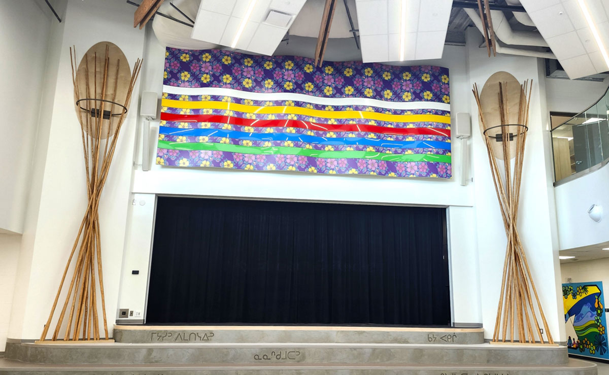 The school will also feature a room where Elders and Knowledge Keepers will share stories and teachings, as well as a tipi structure in an open space near the entrance, which will serve as a gathering place for events and other festivities. The stage is adorned with a ribbon skirt art installation and original tipi poles from the old site.