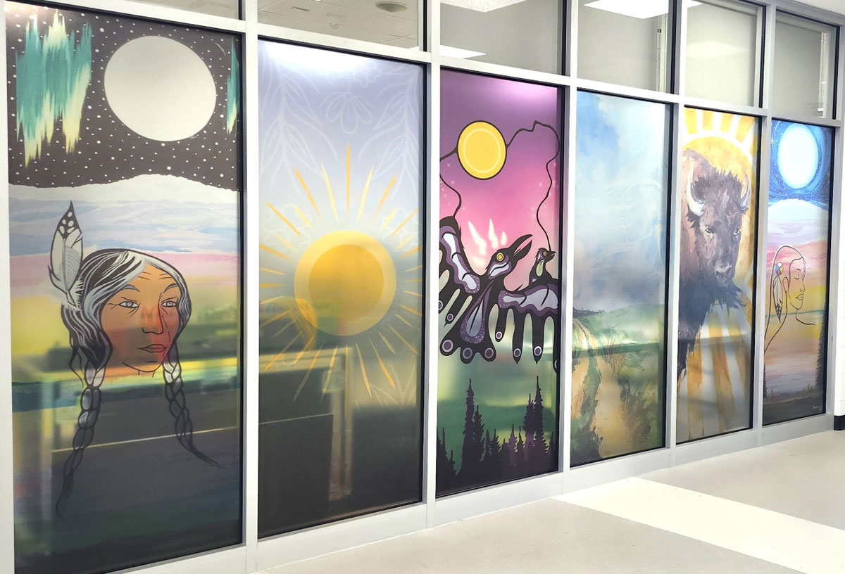 Extensive consultation with Elders, knowledge keepers, students, families and staff means all aspects of the school are culturally aware. Classroom signs in English and Cree, colour schemes on each of the three floors that represent different natural elements (1st floor: Rock; 2nd floor: Earth; 3rd floor: Human), a bulkhead installation that that depicts the constellations of the night sky during the signing of Treaty 6 in 1876 at Fort Pitt, and artwork throughout the building—including a portrait of the school’s namesake St. Francis of Assisi—demonstrate commitment to treaty education, reclamation of Cree language and culture, and the Catholic faith.