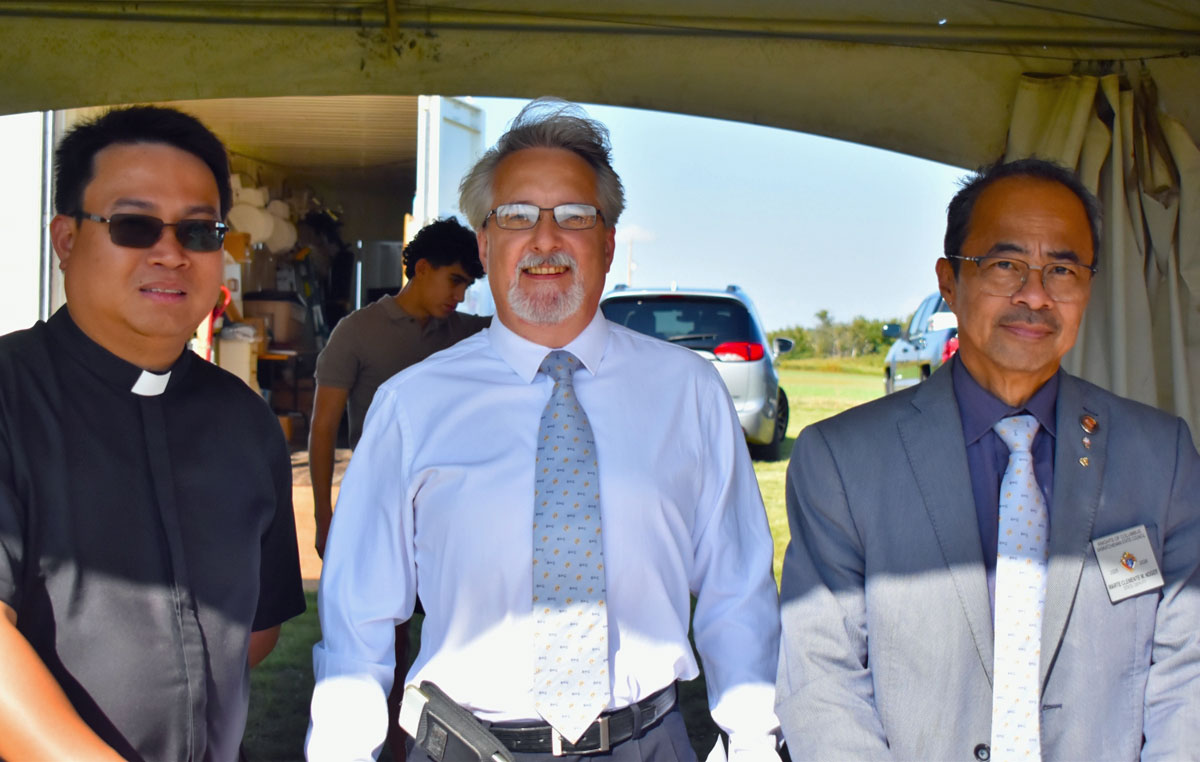 (Left to right:) Knights of Columbus Associate State Chaplain Fr. Bernabe Sajonas, District Deputy Lance LaCroix and State Deputy Marte Nogot at the 2025 Millennium Cross pilgrimage on Sept. 14, 2025. (Photo by Jon Perez, Catholic Saskatoon News)