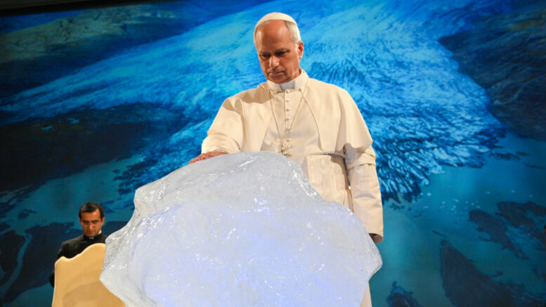 Seated behind a slowly melting chunk of ice from a glacier in Greenland, the pope said, “God will ask us if we have cultivated and cared for the world that he created, for the benefit of all and for future generations, and if we have taken care of our brothers and sisters.”