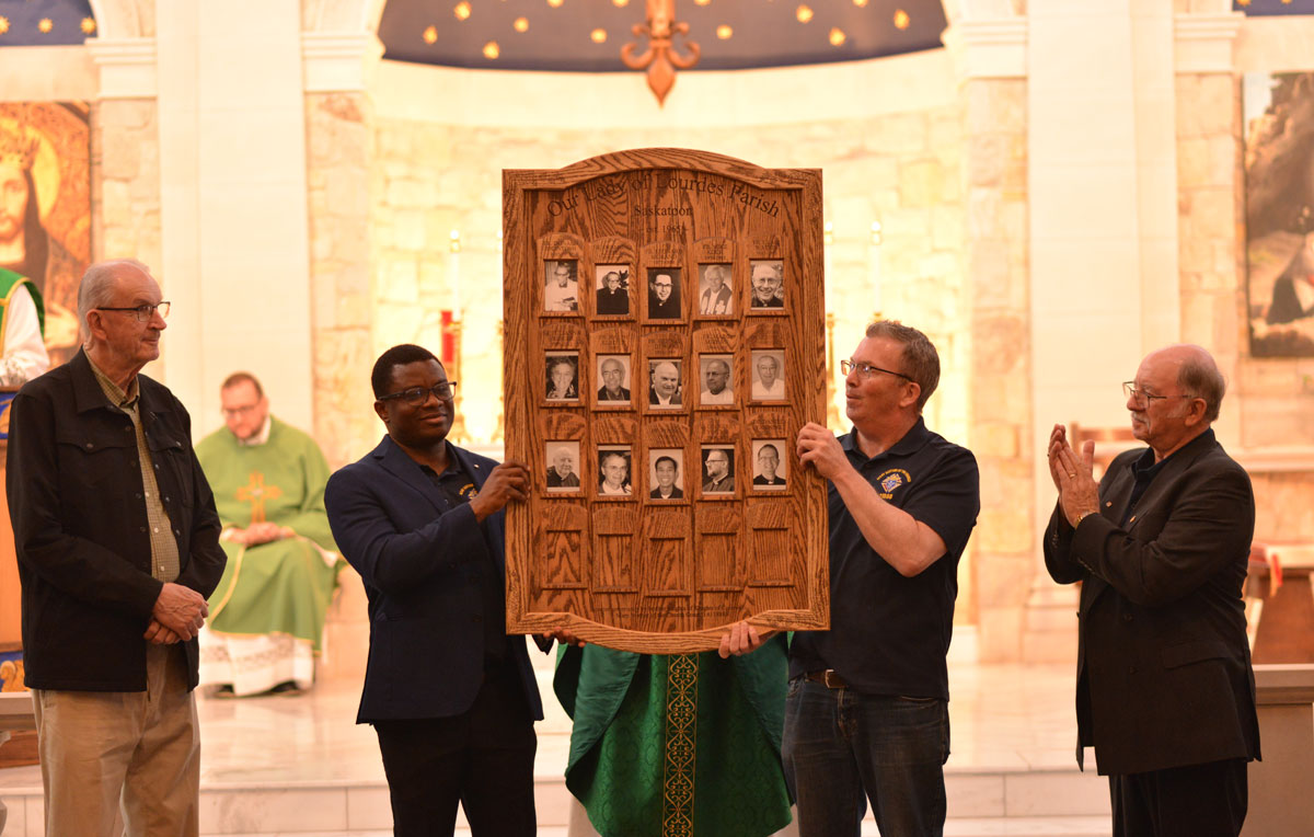 During the celebration, members of Knights of Columbus council #11888 Mary Mother of the Church, presented a plaque honouring pastors and parish life directors who have served Our Lady of Lourdes from its designation as a parish in 1965 to the present day. The plaque was created by local Catholic artisan Alex Florizone of Ministro Woodworking.