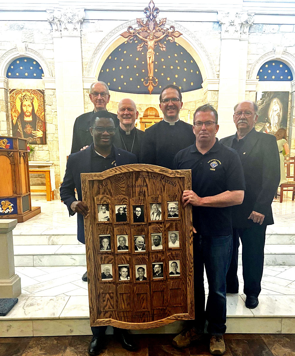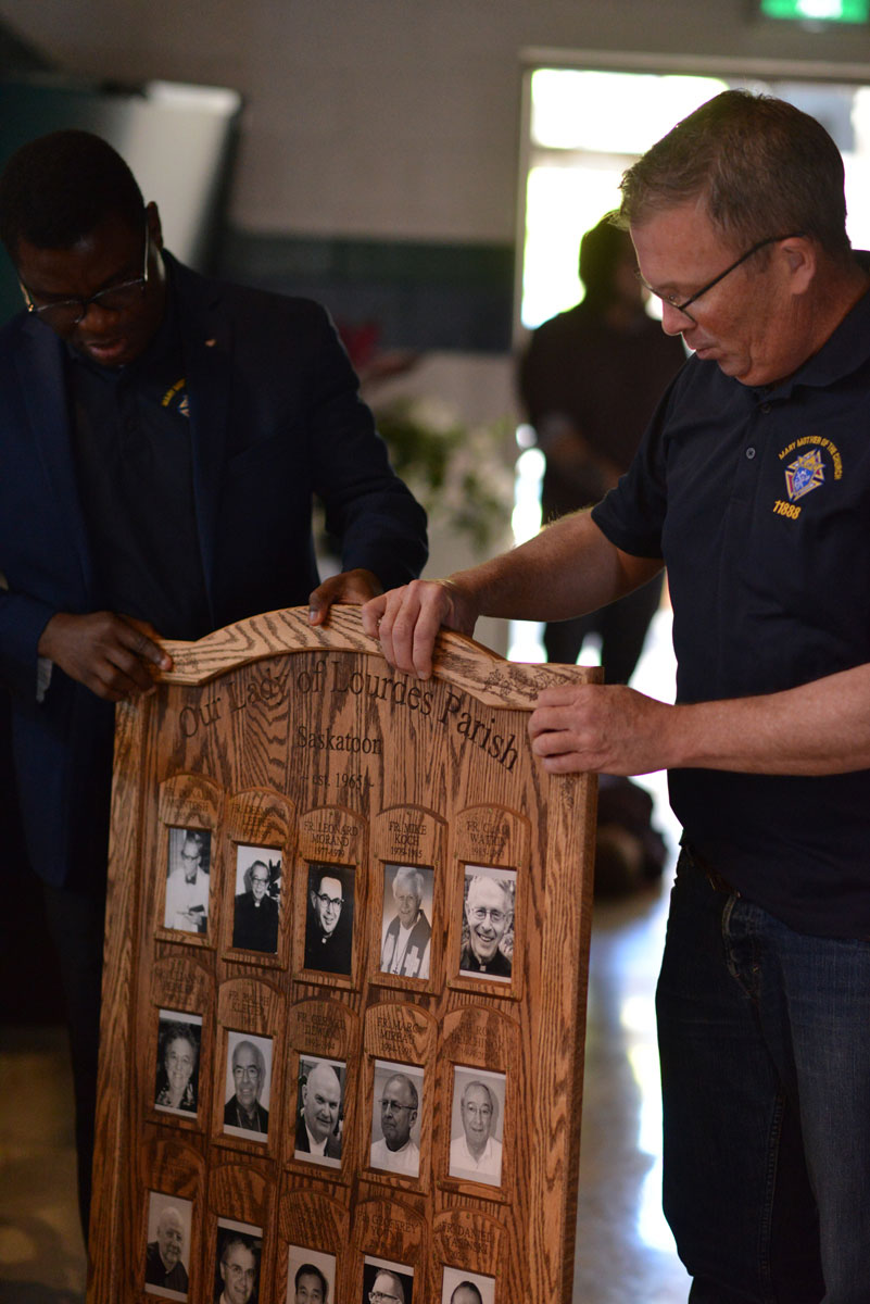During the celebration, members of Knights of Columbus council #11888 Mary Mother of the Church, presented a plaque honouring pastors and parish life directors who have served Our Lady of Lourdes from its designation as a parish in 1965 to the present day. The plaque was created by local Catholic artisan Alex Florizone of Ministro Woodworking.