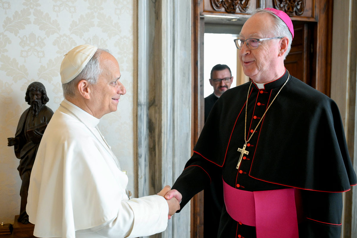 Pope Leo XIV greets Canadian Archbishop Richard Smith of Vancouver, a member of the Canadian Catholic Indigenous Council, in the library of the Apostolic Palace Nov. 15, 2025. The pope gave the Canadian bishops 62 artifacts that will be returned to Indigenous communities in Canada. (CNS photo/Vatican Media)