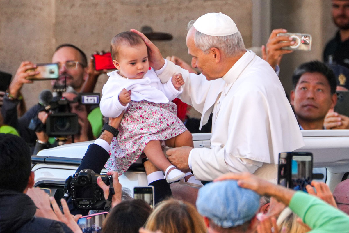 Pope Leo XIV greets greets a child as he rides around St. Peter’s Square following Mass for the Jubilee of Catechists at the Vatican Sept. 28, 2025. (Photo by Lola Gomez, CNS)